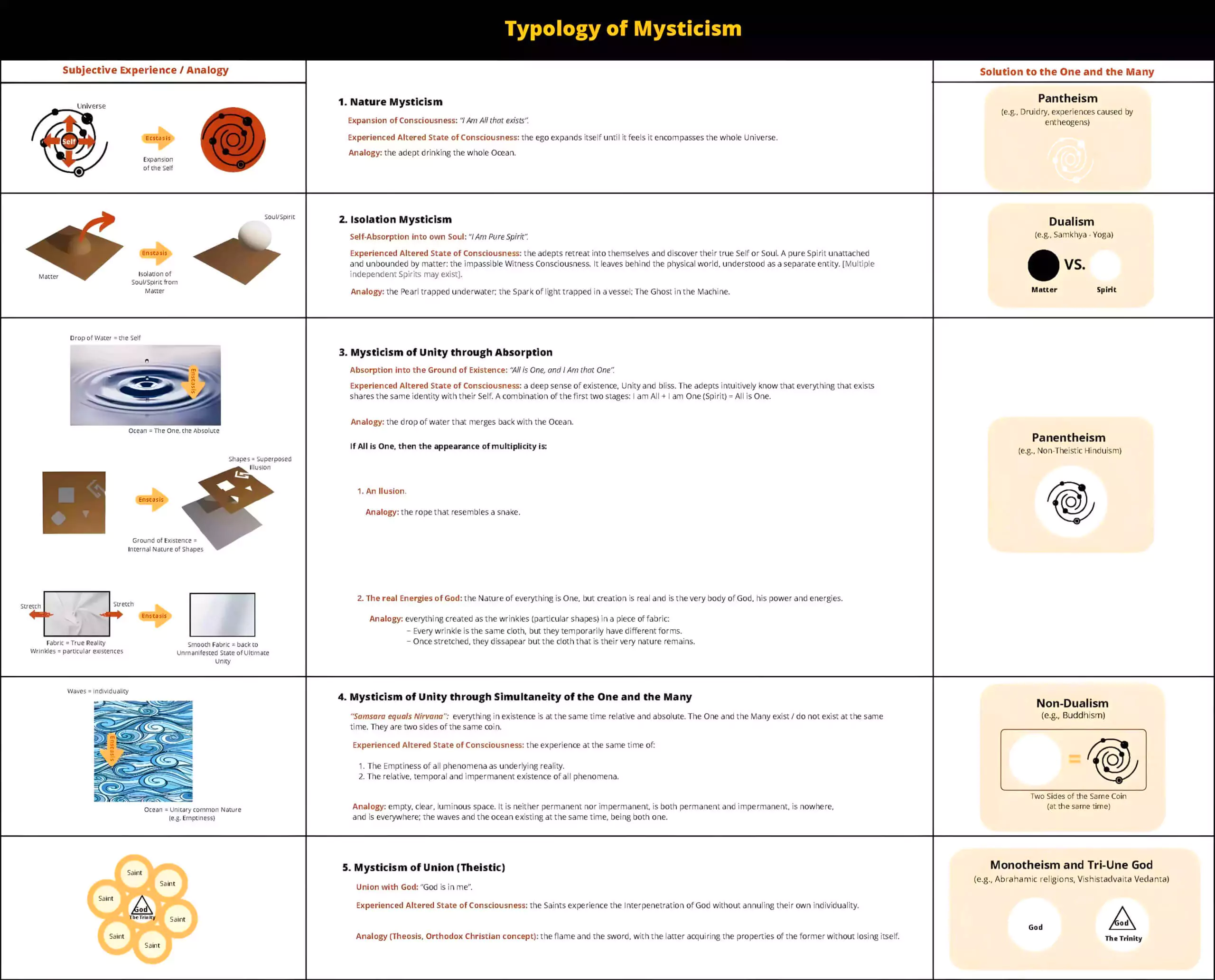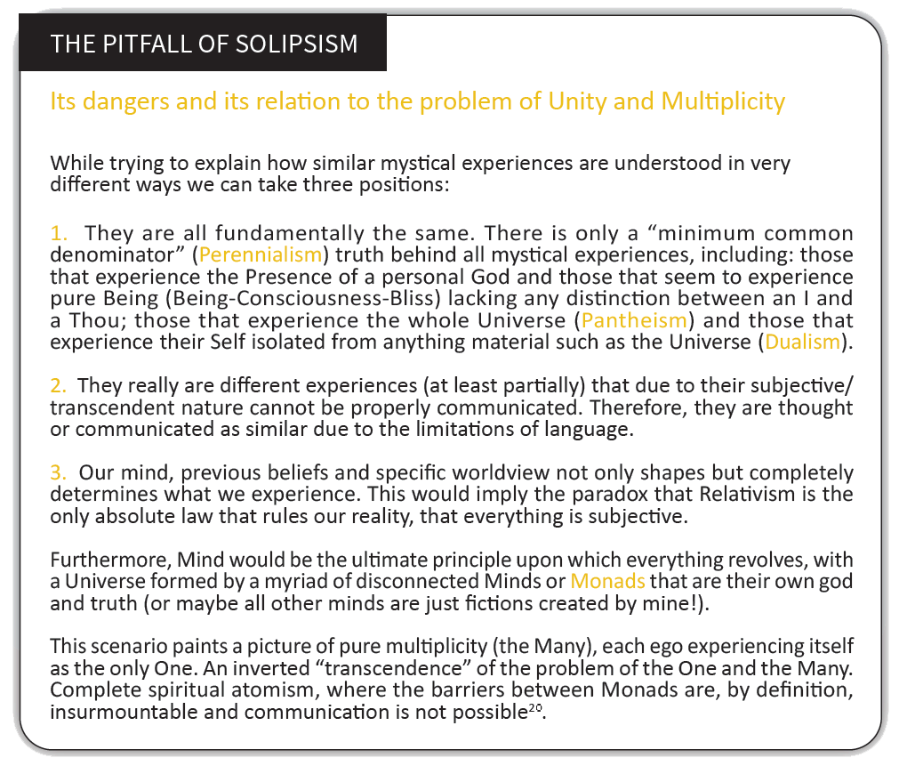 This category of Theistic Mysticism, which apparently conflates pure monistic Monotheism (one of the doctrines of the One) and the Tri-Une God of Christianity (not defined by the One/Many dialectic) as having the same subjective experiences, however, is more complex than it appears at first sight. It will be further expanded upon in the next articles but, for now, it is sufficient to understand the different subjective experiences of both theistic and non-theistic mysticism.