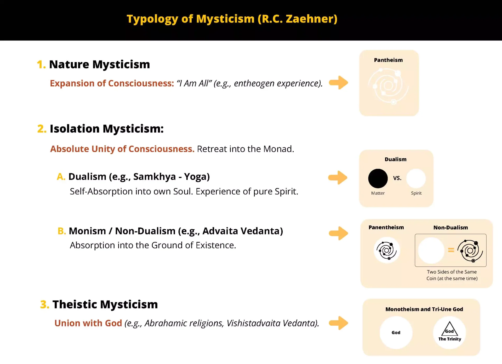 Zaehner further subdivided the category of Isolation Mysticism in two: Dualism and absolute Monism, with the Hindu paradigmatic examples of Samkhya / Yoga and Advaita Vedanta as representatives of each one.